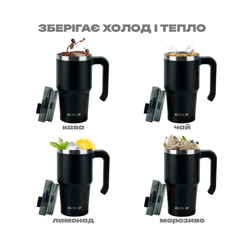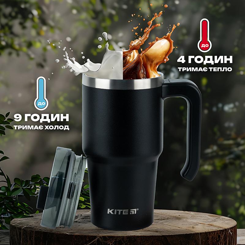 Термокружка Kite K24-1207-1, чорна – незамінна в дорозі, на прогулянках і пікніках. Вона чудово утримує тепло або холод, зберігаючи температуру напоїв до 4-х годин. Ви зможете довго ласувати гарячим ароматним чаєм або ідеально крижаним лимонадом.