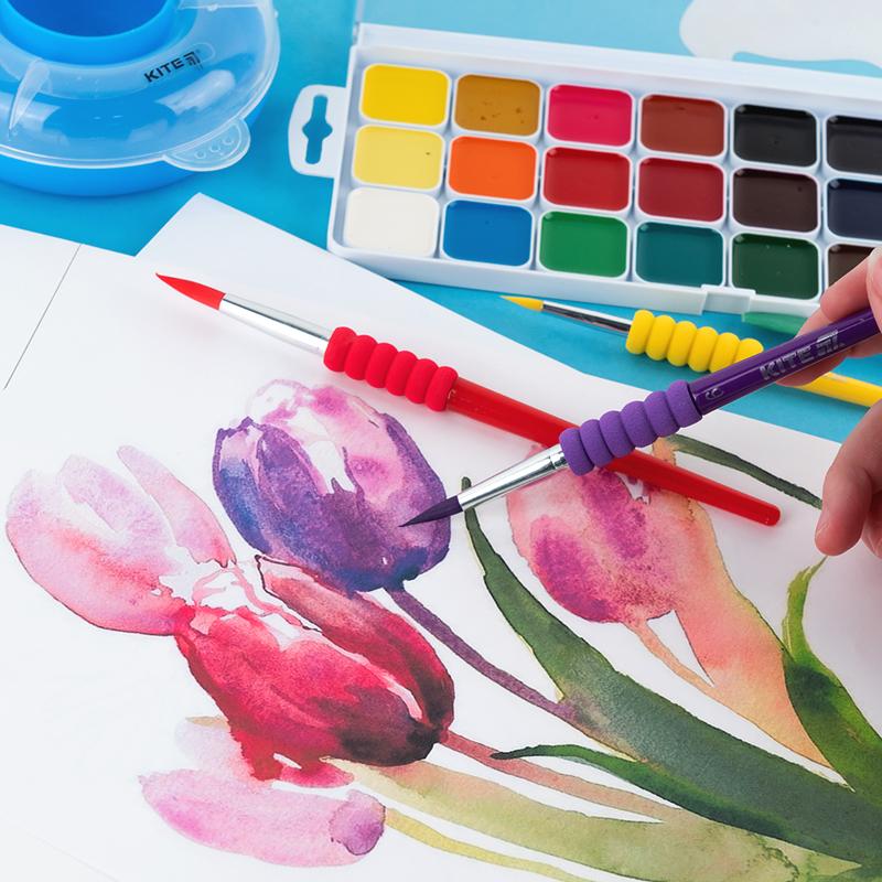 Чотири пензлики з м’яким грипом допомагають дітям впевнено тримати пензель у руці й створювати художні шедеври без зайвих зусиль. Ергономічна накладка з м'якого та приємного на дотик EVA-матеріалу не ковзає в руці та зменшує втому пальців під час тривалого малювання. Якісний синтетичний ворс – міцно зафіксований, добре набирає фарбу та рівномірно її віддає на папір. Різні форми й розміри пензликів дозволяють працювати як над дрібними деталями, так і над великими мазками.