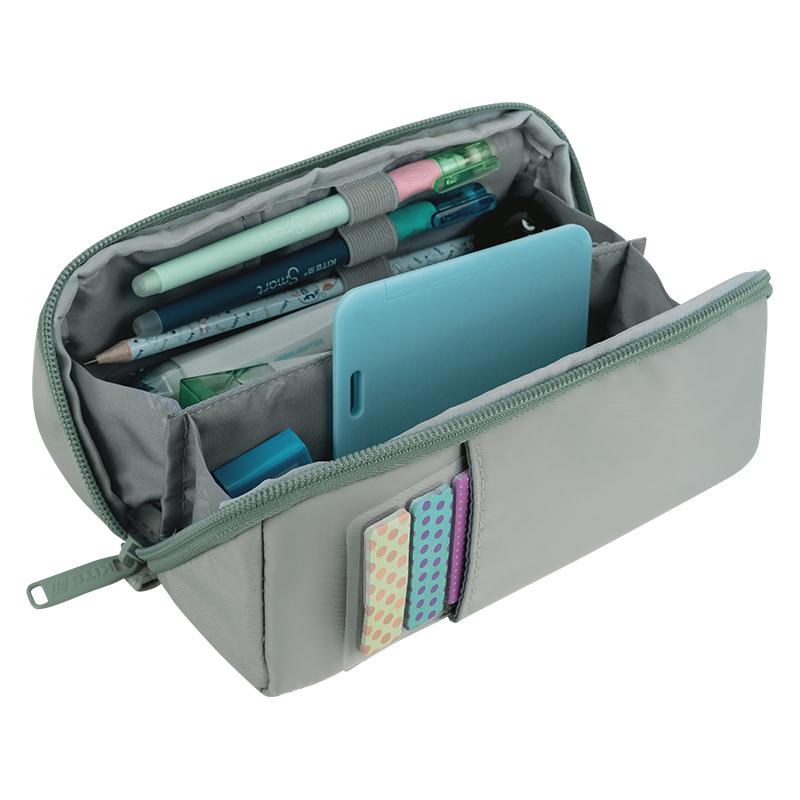 Модель виготовлена із гладенької щільної тканини, що не тільки надає їй стильного вигляду, але й забезпечує надійність у використанні. Лаконічний дизайн з гармонійною палітрою кольорів робить пенал ідеальним для тих, хто цінує мінімалізм і практичність. Його компактний розмір дозволяє зберігати все необхідне, не займаючи багато місця в рюкзаку.