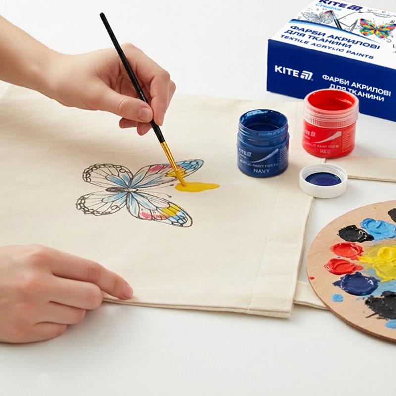 Розкрийте свій креатив разом із Kite Creative. Фарби для тканини ідеально підходять для декорування натуральних (бавовна, льон, шовк, віскоза) та змішаних тканин, що містять до 20-30% синтетичних волокон. Яскраві, насичені кольори допоможуть створити неповторний дизайн на футболках, сумках, аксесуарах та інших виробах.