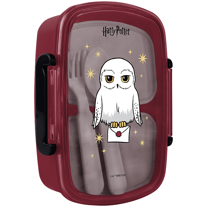 Внутрішнє наповнення включає столове приладдя для комфортного перекусу: виделка, ложка та два контейнери. Таким чином, можна складати різні страви в один ланчбокс. Це дуже зручно та гігієнічно.