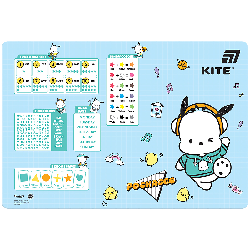 Настільна пластикова підкладка Pochacco використовується для творчості: малювання фарбами і олівцями, ліплення пластиліном, роботи з клеєм і папером. Також підкладку можна використовувати під столові прилади.