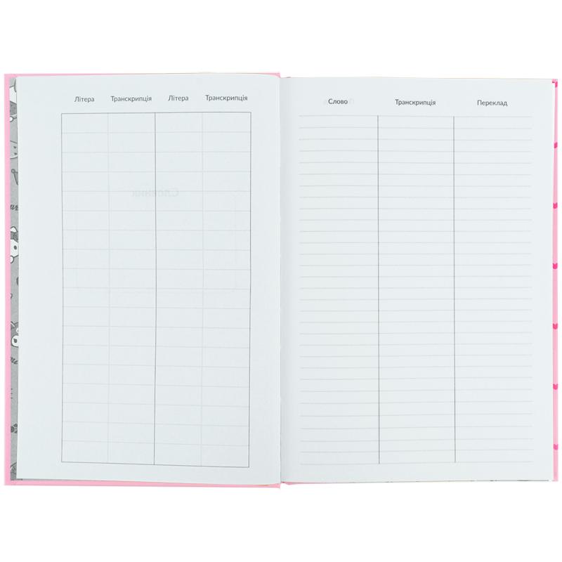 Передбачені окремі сторінки для запису правил. На якісному світлому папері щільністю 65 г/м2 комфортно писати. Практична обкладинка забезпечує тривале збереження словника в акуратному вигляді. Тверда палітурка – ідеальне рішення, адже словник буде використовуватися не один семестр. Стильний дизайн додасть гарного настрою та надихатиме навчатися із задоволенням.