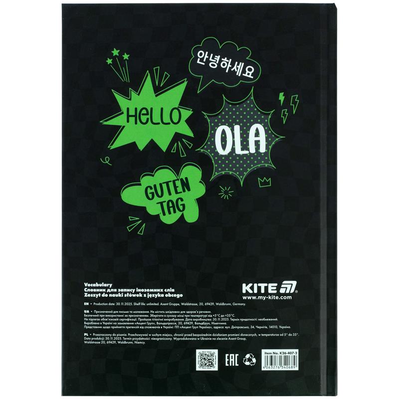 Словник для іноземної мови Kite K26-407-2 Привіт, 60 аркушів – надихає із задоволенням вивчати нову лексику. Лініювання – чітке та зручне, з полями для запису слів, транскрипцій і перекладу. На форзаці: англійський, французький, німецький та польський алфавіти.
