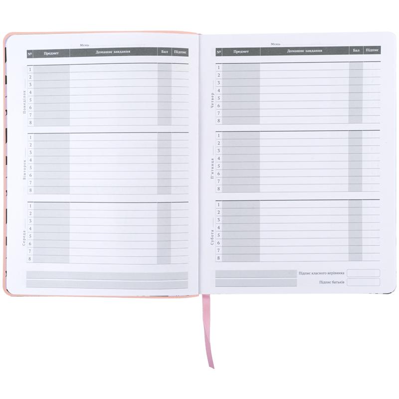 Щоденник розрахований на 46 тижнів. Також містить важливу інформацію: Державну символіку та гімн України, поле для списку вчителів та сторінку для підсумкових балів.