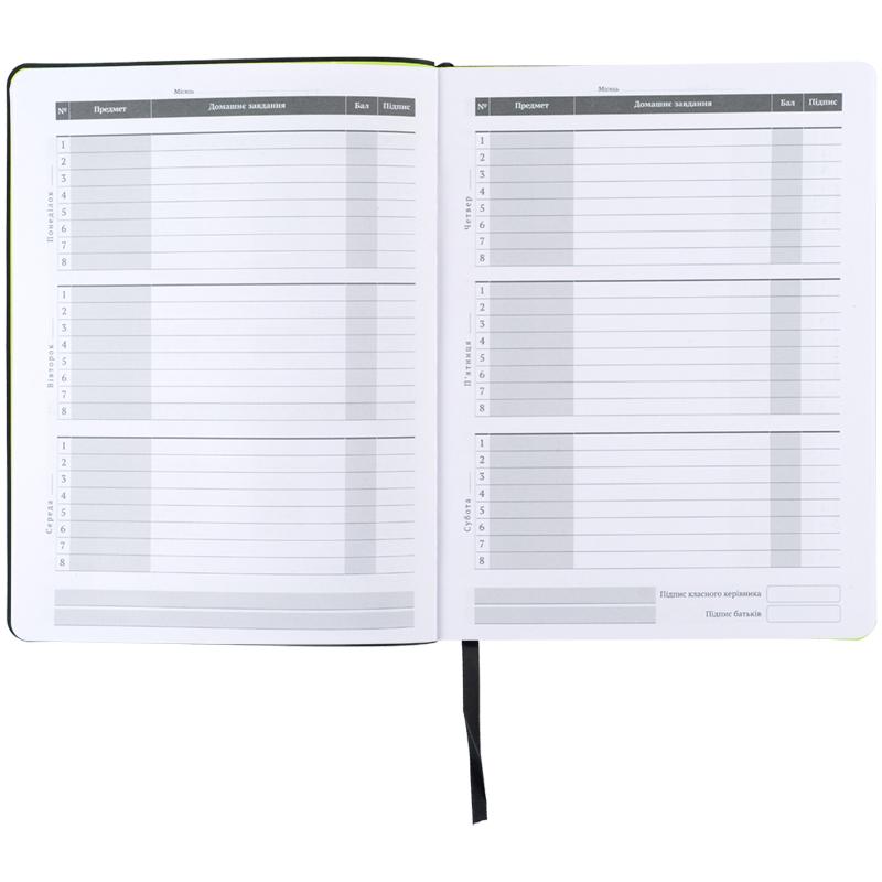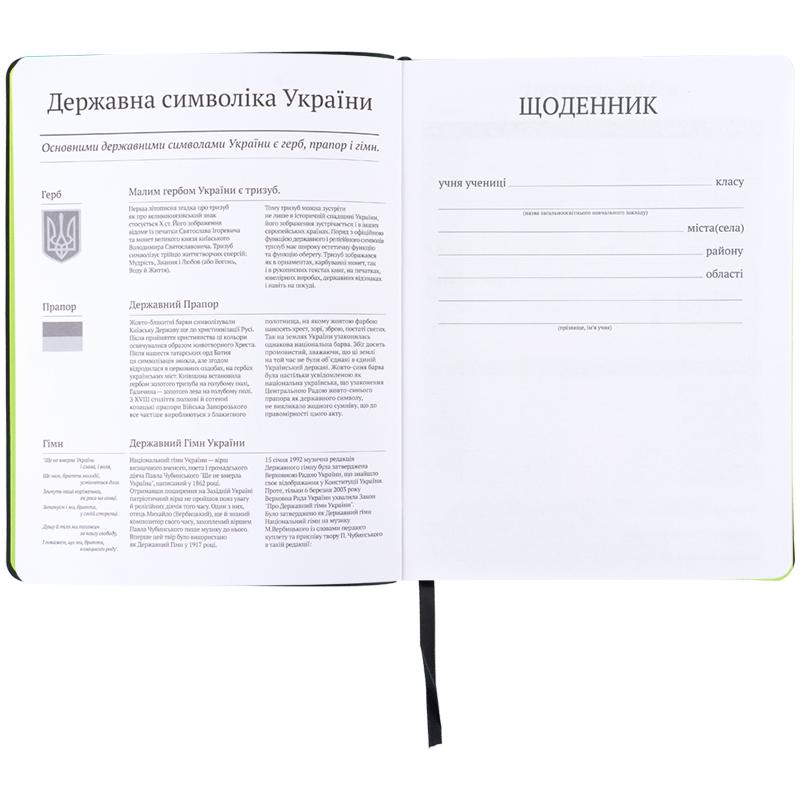 Щоденник розрахований на 46 тижнів. Також містить важливу інформацію: Державну символіку та гімн України, поле для списку вчителів та сторінку для підсумкових балів.