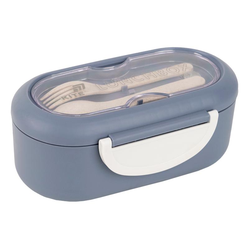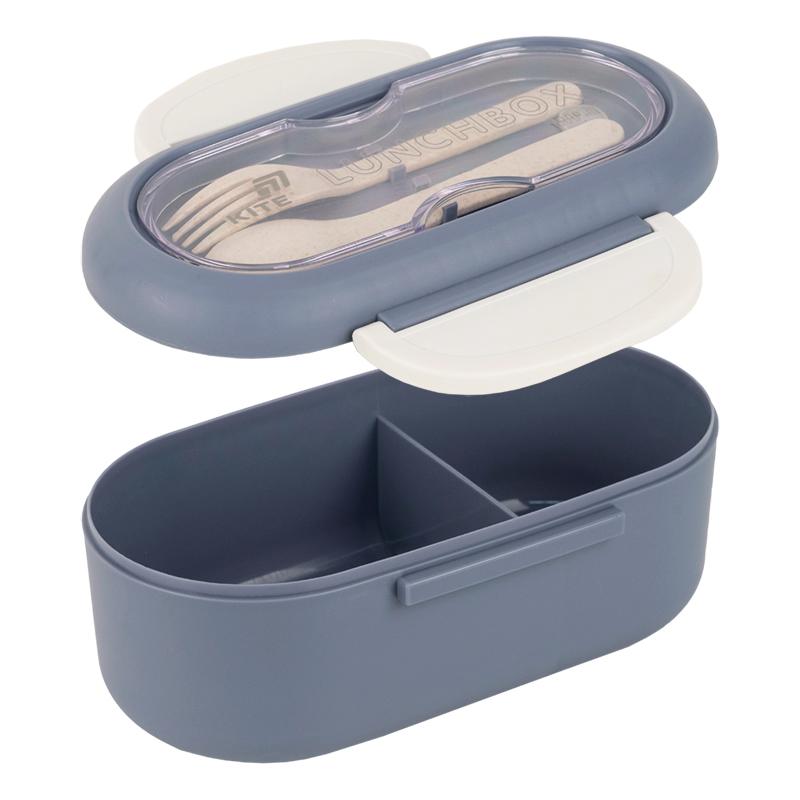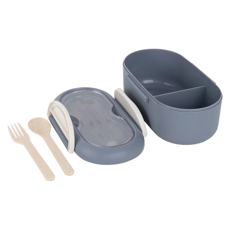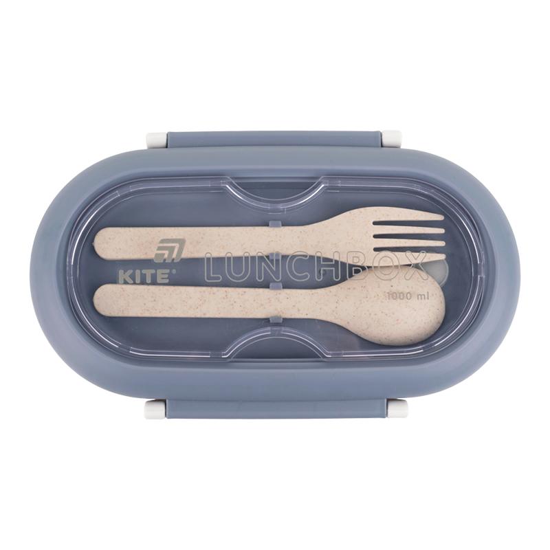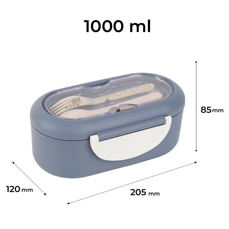 Ланчбокс для їжі. Виготовлений з харчового пластику. Основа розділена на 2 відділення, доповнений столовим приладдям. Об'єм 1000 мл.