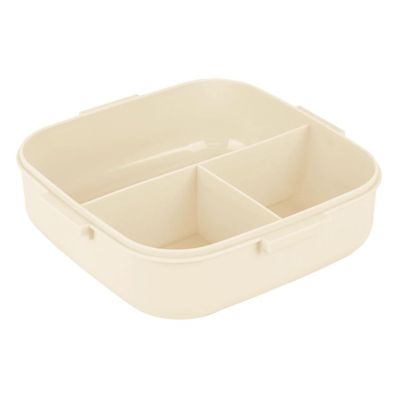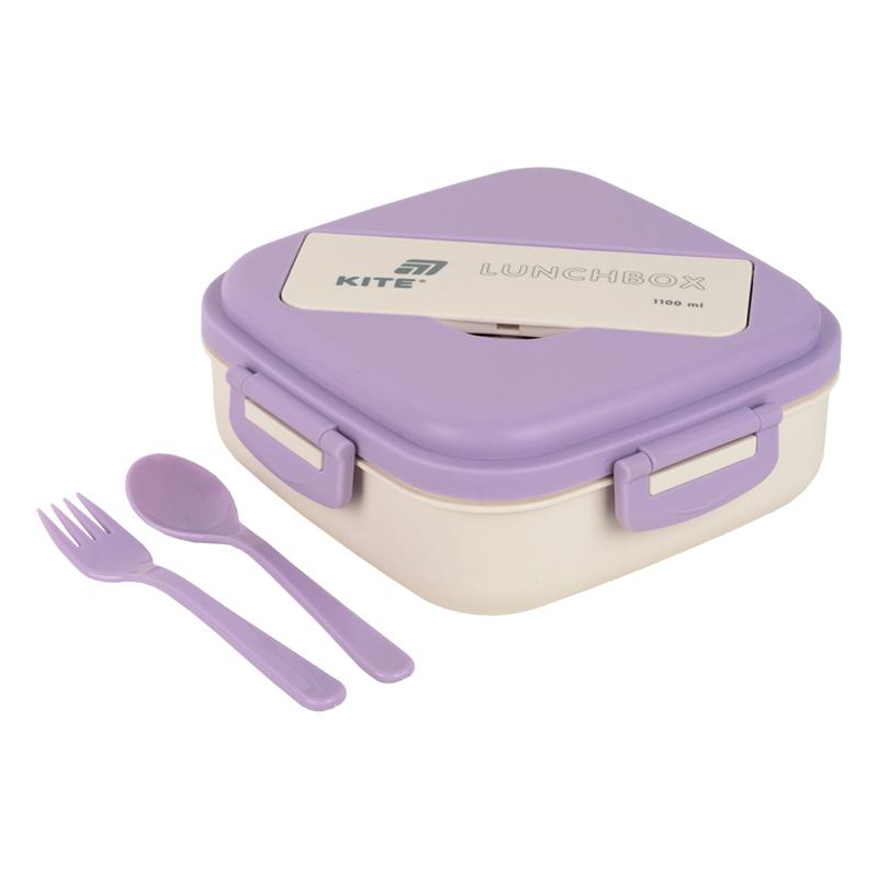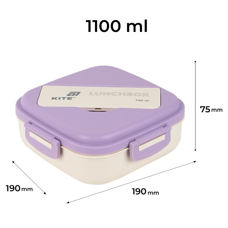 Ланчбокс для їжі. Виготовлений з харчового пластику. Основа розділена на 3 відділення, доповнений столовим приладдям. Об'єм 1100 мл.