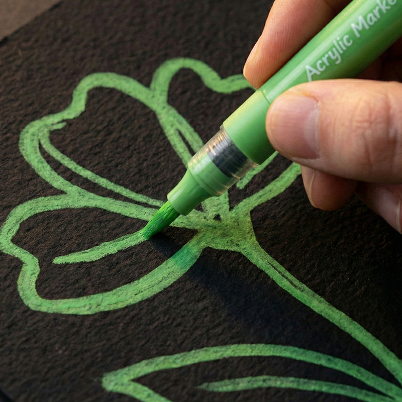 Гнучкий пишучий вузлик у формі пензлика дозволяє створювати як тонкі, так і широкі мазки, втілюючи будь-який творчий задум. Насичені акрилові чорнила лягають щільно та яскраво на різні поверхні: папір, картон, дерево, камінь, кераміку чи тканину.