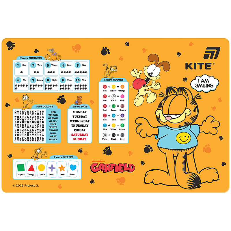 Настільна пластикова підкладка Garfield використовується для творчості: малювання фарбами і олівцями, ліплення пластиліном, роботи з клеєм і папером. Також підкладку можна використовувати під столові прилади.