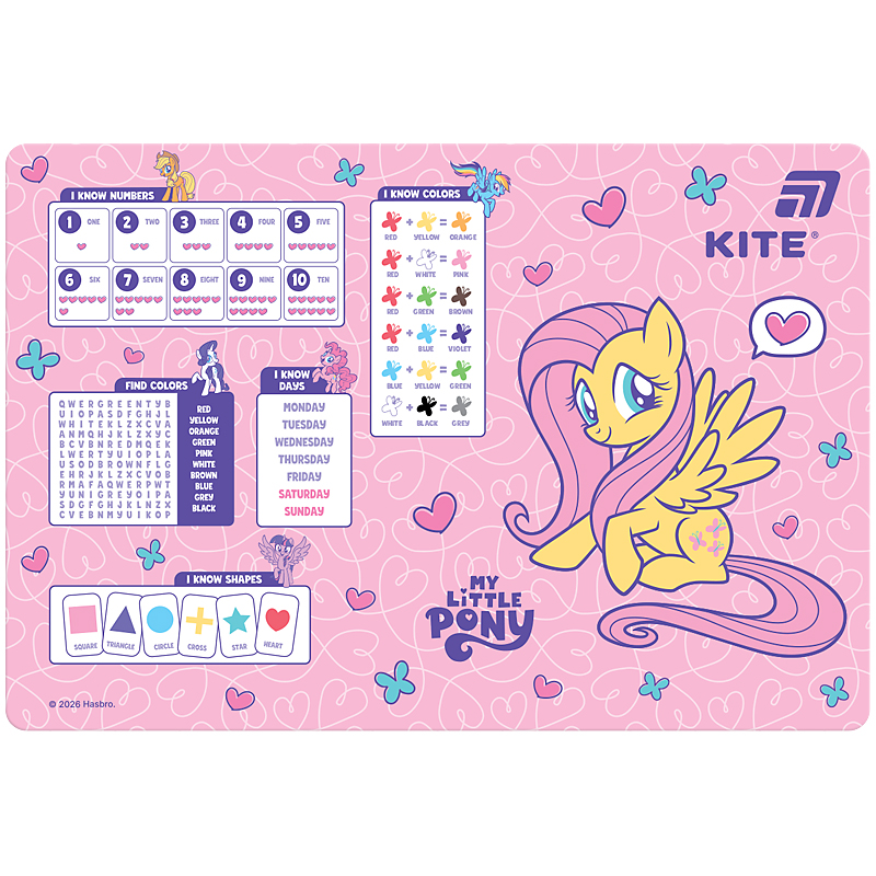 Настільна пластикова підкладка My Little Pony використовується для творчості: малювання фарбами і олівцями, ліплення пластиліном, роботи з клеєм і папером. Також підкладку можна використовувати під столові прилади.
