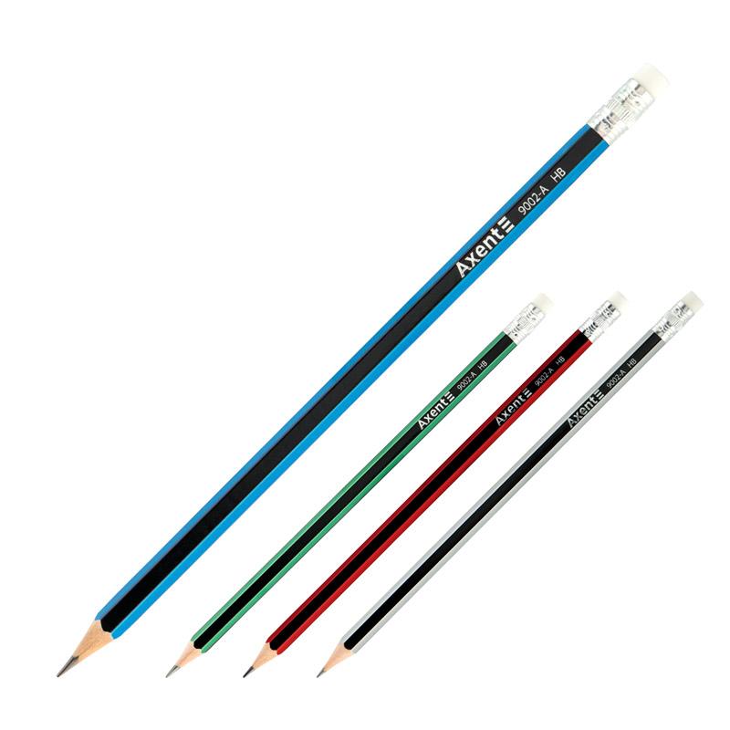 Олівець графітний, шестигранний, з гумкою. Твердість НВ. Покриття: кольоровий лак-металік, дві чорні грані, чорні смуги на ребрах. Асортимент кольорів корпусу: бордовий, синій, зелений, сірий. Упаковка - 12 шт. в картонній коробці.