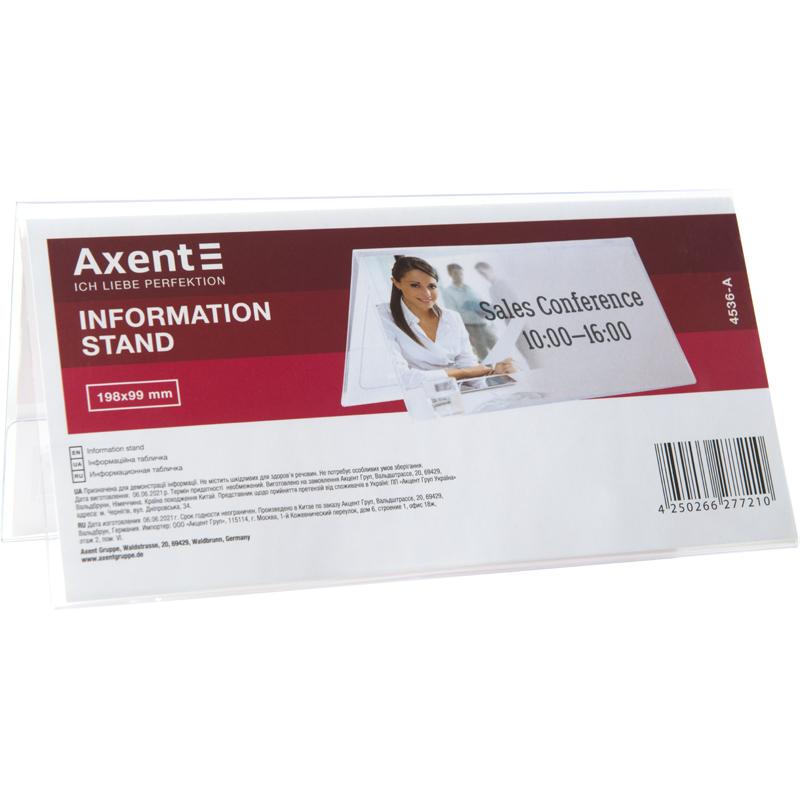 Табличка інформаційна Axent 4536-A використовується на рецепції готелів, в кафе, ресторанах, на презентаціях. Зручна виїмка для пальців дозволяє легко замінити вкладиш в табличці. Матеріал: кристально прозорий пластик. Розмір: 198х99 мм Двостороння.