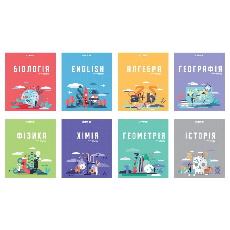 • в наборі – 8 предметних зошитів: Географія, Алгебра, Геометрія, Історія, Англійська мова, Фізика, Хімія, Біологія;