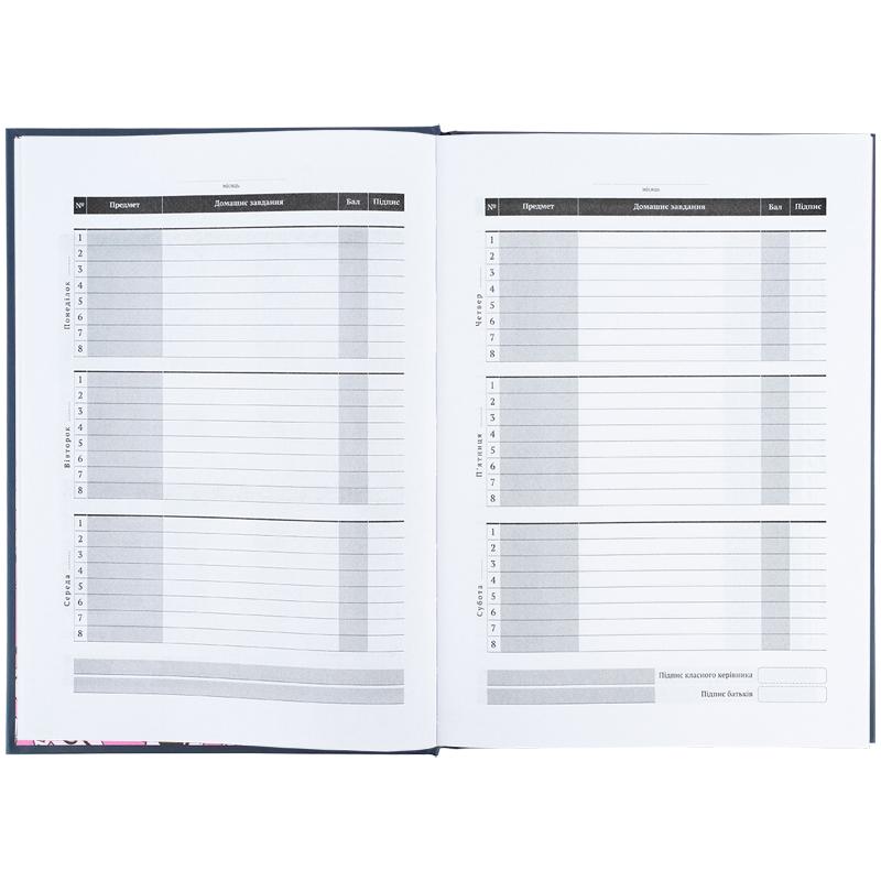 Щоденник розрахований на 46 тижнів. Також містить корисну інформацію: Державну символіку та Гімн, поле для списку вчителів та сторінку для підсумкових балів.