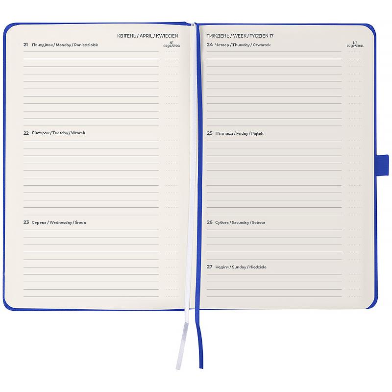 Тверда обкладинка з вінілу допомагає зберегти акуратний та презентабельний вигляд протягом довгого часу. Якісний кремовий папір щільністю 80 г/м2 добре вбирає чорнило та забезпечує комфортне письмо. Зручно робити записи, креслити та малювати. Щотижневик поділений на 2 частини – датований блок у лінію для зручного планування справ і додаткові сторінки у клітинку для ведення особистих записів.