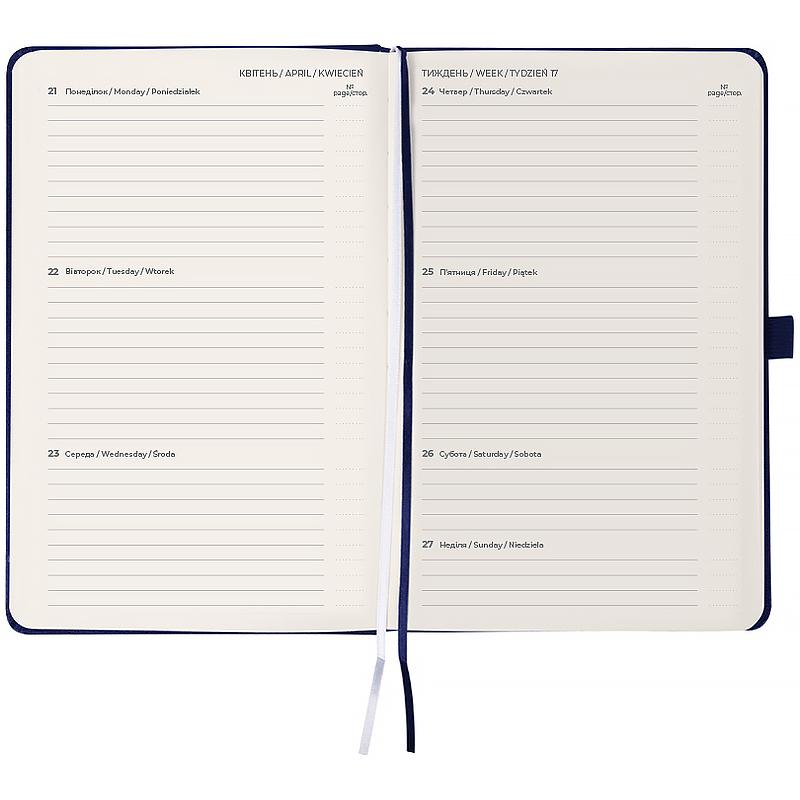 Тверда обкладинка з вінілу допомагає зберегти акуратний та презентабельний вигляд протягом довгого часу. Якісний кремовий папір щільністю 80 г/м2 добре вбирає чорнило та забезпечує комфортне письмо. Зручно робити записи, креслити та малювати. Щотижневик поділений на 2 частини – датований блок у лінію для зручного планування справ і додаткові сторінки у клітинку для ведення особистих записів.