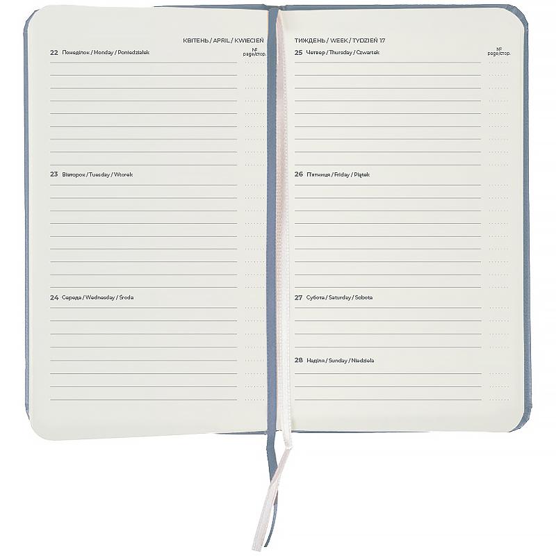 Тверда обкладинка з вінілу допомагає зберегти акуратний та презентабельний вигляд протягом довгого часу. Якісний кремовий папір щільністю 80 г/м2 добре вбирає чорнило та забезпечує комфортне письмо. Зручно робити записи, креслити та малювати. Щотижневик поділений на 2 частини – датований блок у лінію для зручного планування справ і додаткові сторінки у клітинку для ведення особистих записів.