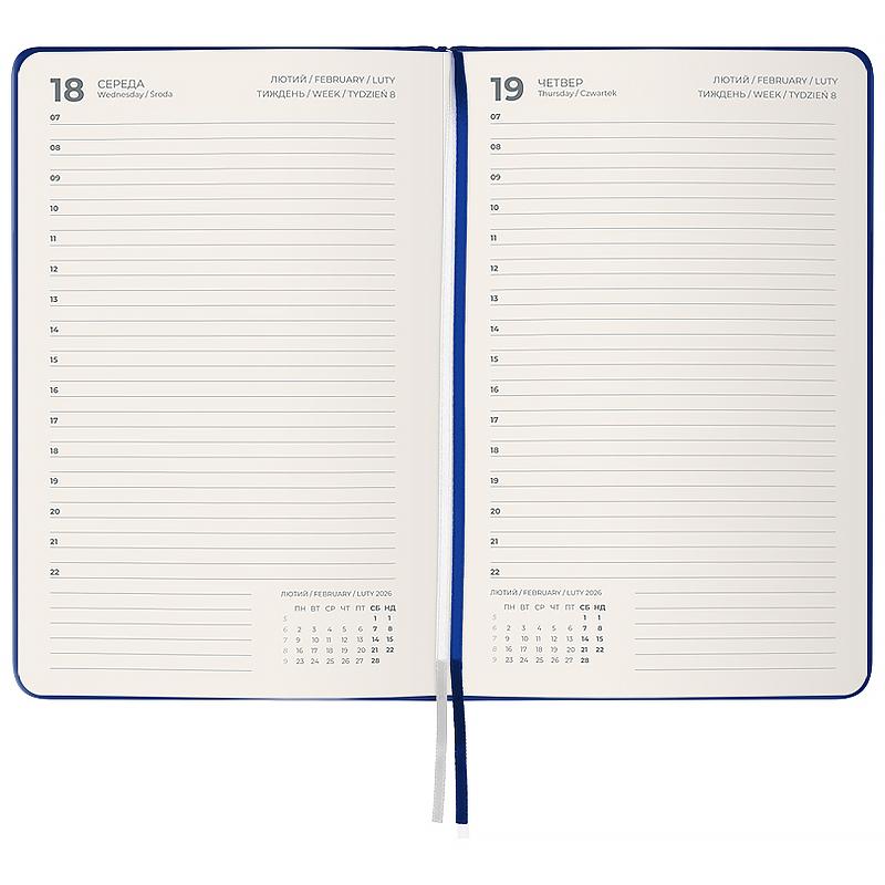 Внутрішній блок українською мовою. Щоденник містить календар на 2026-2027 рік, загальний тижневий розклад, інформацію про свята, важливі номери телефонів, часові пояси країн світу, одиниці вимірювання, шкалу температур.