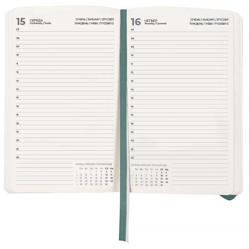 Внутрішній блок українською мовою. Щоденник містить календар на 2026-2027 рік, загальний тижневий розклад, інформацію про свята, важливі номери телефонів, часові пояси країн світу, одиниці вимірювання, шкалу температур.