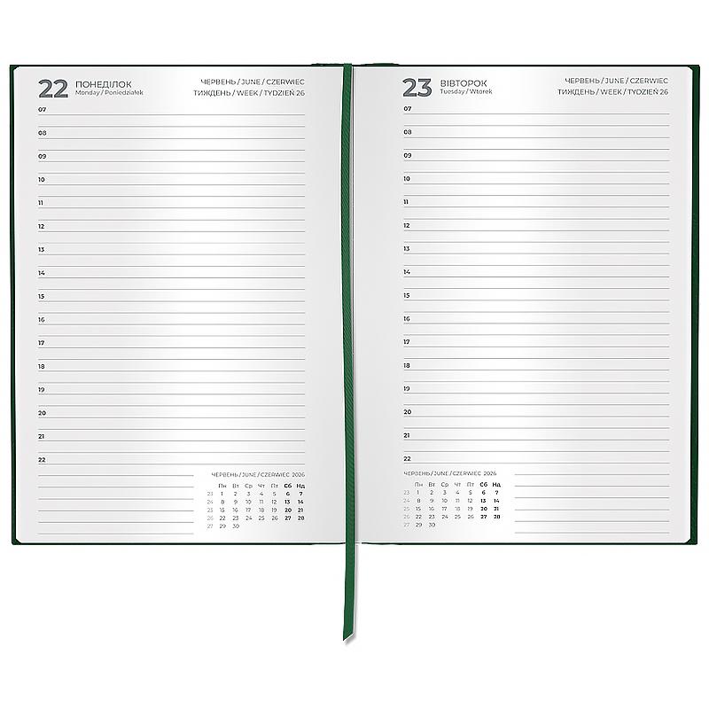 Внутрішній блок українською мовою. Щоденник містить календар на 2026-2027 рік, загальний тижневий розклад, інформацію про свята, важливі номери телефонів, часові пояси країн світу, одиниці вимірювання, шкалу температур.