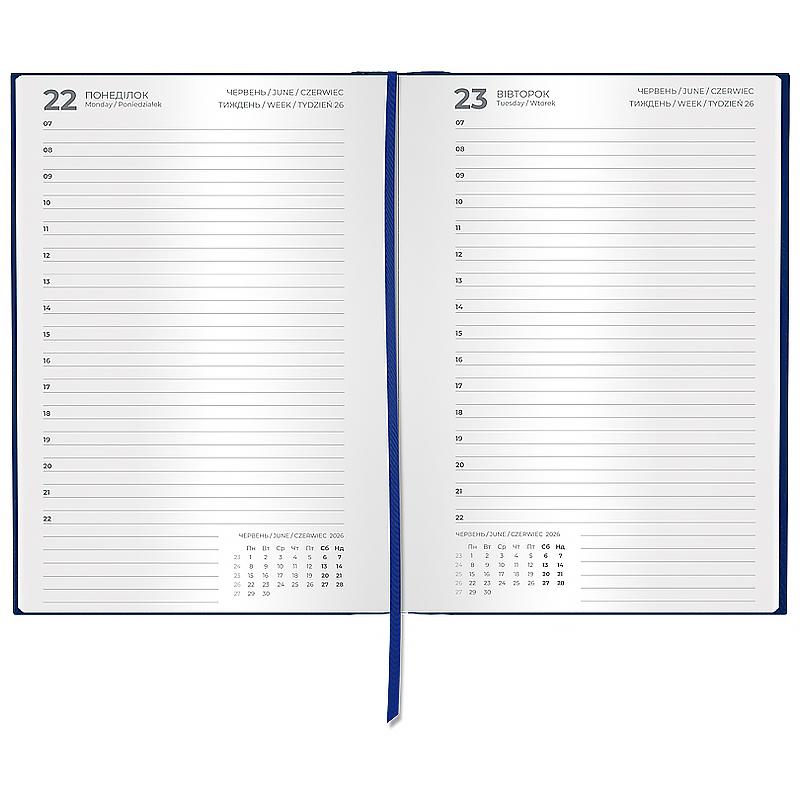 Внутрішній блок українською мовою. Щоденник містить календар на 2026-2027 рік, загальний тижневий розклад, інформацію про свята, важливі номери телефонів, часові пояси країн світу, одиниці вимірювання, шкалу температур.