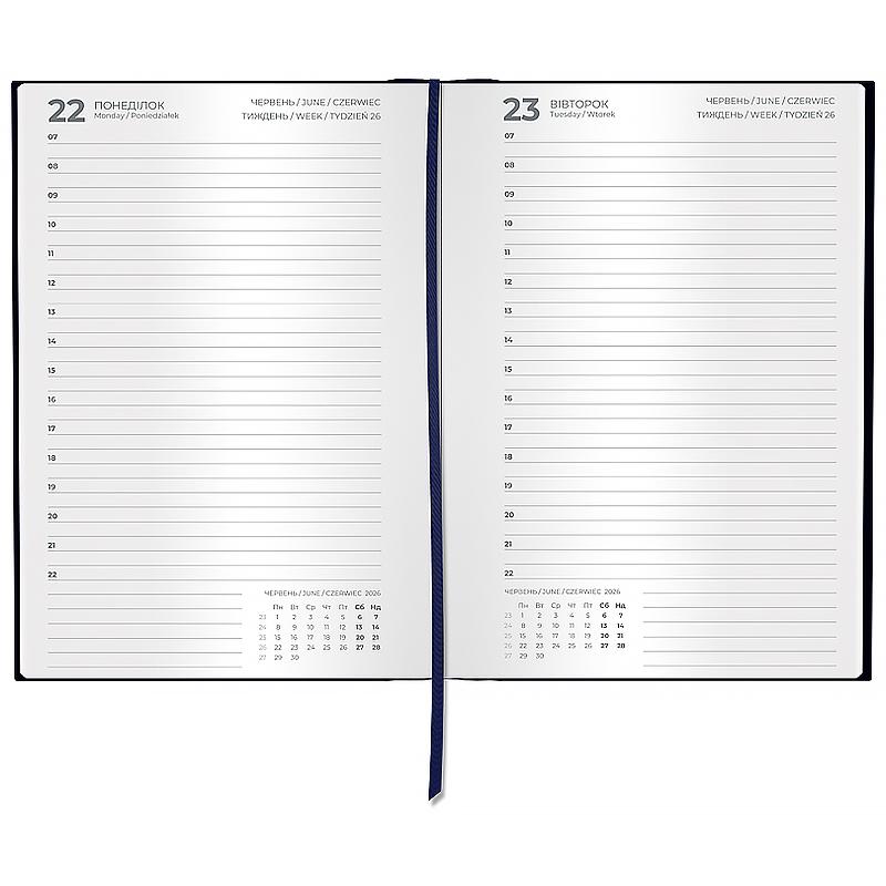 Внутрішній блок українською мовою. Щоденник містить календар на 2026-2027 рік, загальний тижневий розклад, інформацію про свята, важливі номери телефонів, часові пояси країн світу, одиниці вимірювання, шкалу температур.