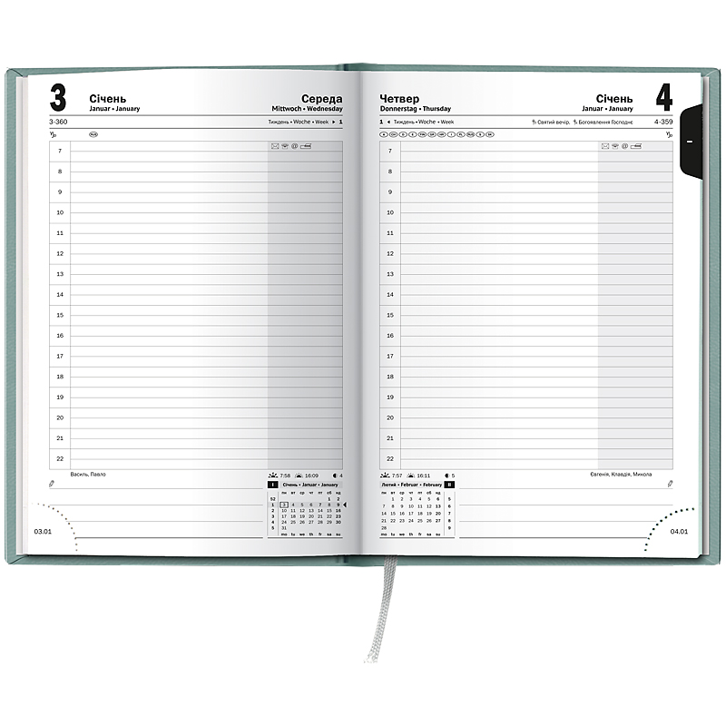 Особливості: Три мови: українська, англійська, німецька. Загальна кількість сторінок — 336. Одна сторінка — один день.