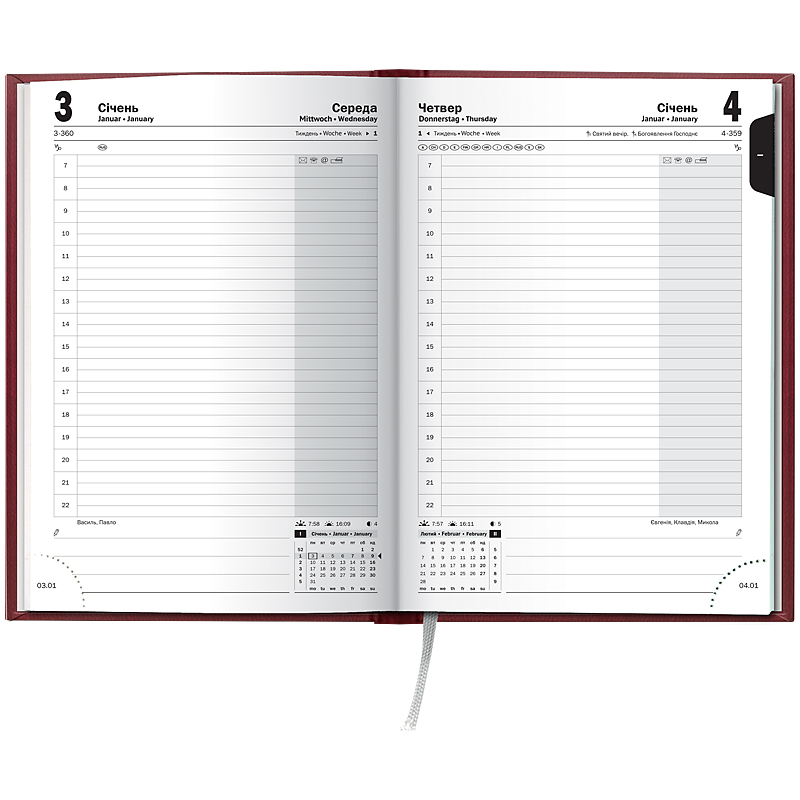 Особливості: Три мови: українська, англійська, німецька. Загальна кількість сторінок — 336. Одна сторінка — один день.