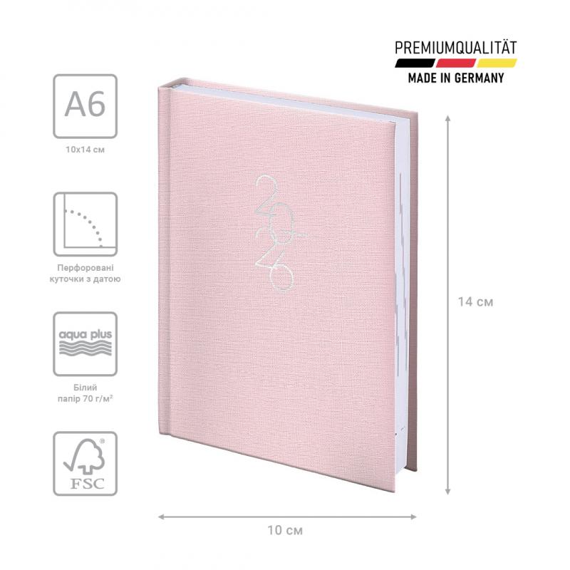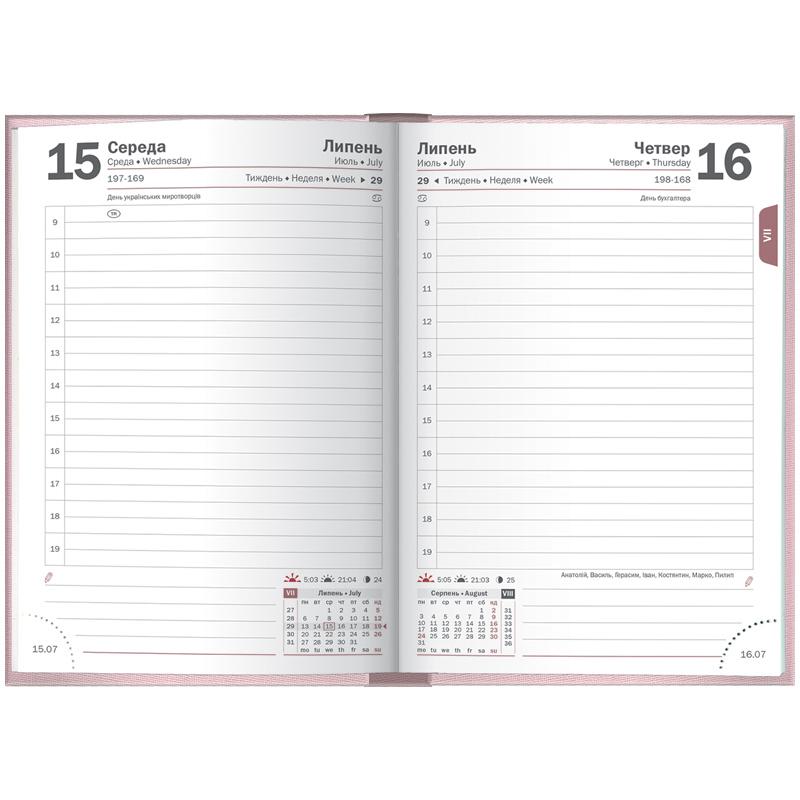 Особливості: Компактний формат А6. Три мови: українська, англійська, німецька. Кремові форзаци. 1 сторінка – 1 день. Субота та неділя на одній сторінці. Організатор з 09:00 до 19:00. Інформаційний блок. Перфоровані датовані куточки.