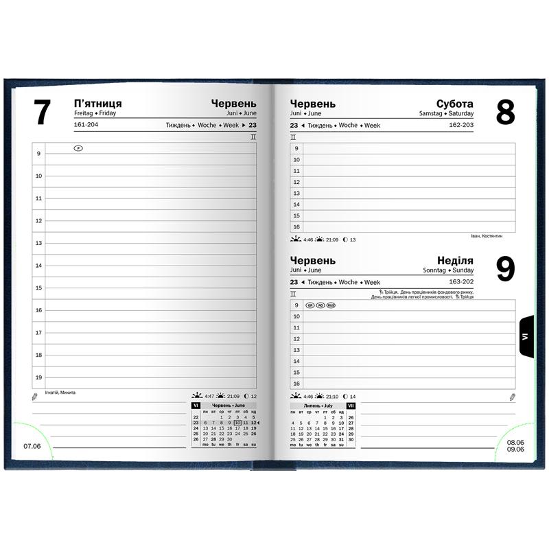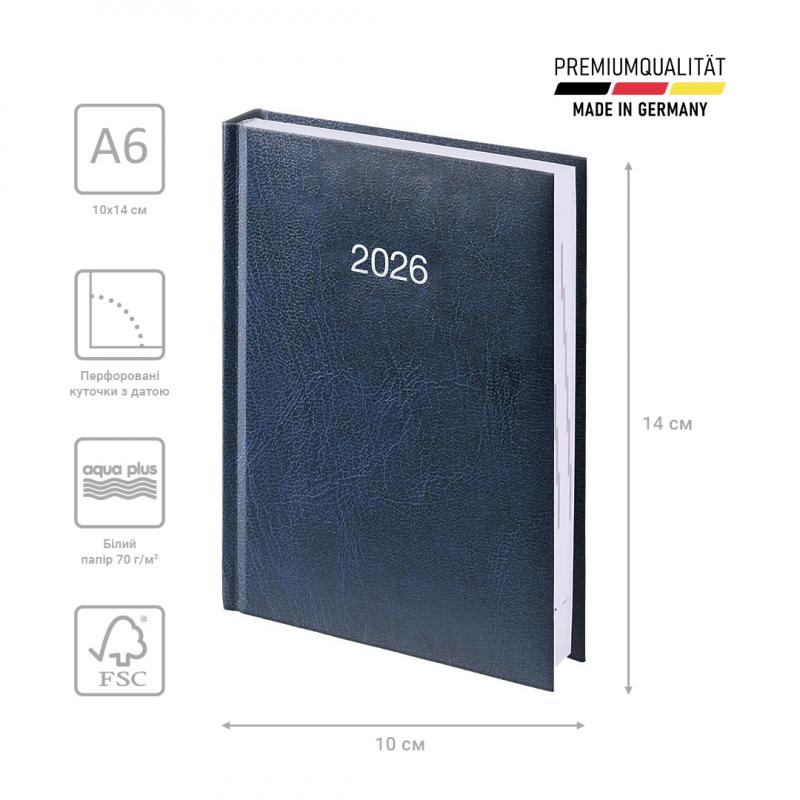 Завдяки кишеньковому формату А6, його зручно завжди тримати під рукою. Жодна геніальна думка не забудеться, жодна зустріч не загубиться: лаконічна датована модель має продуманий внутрішній блок із поділом за часом. Легендарна німецька якість відображена в кожній деталі. Ексклюзивне клейове кріплення, гладенький білий папір, бездоганно чіткий друк. Обкладинка – стильна, практична, приємна на дотик.
