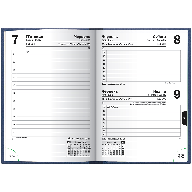 Особливості: Компактний формат А6. Три мови: українська, англійська, німецька. Кремові форзаци. 1 сторінка – 1 день. Субота та неділя на одній сторінці. Організатор з 09:00 до 19:00. Інформаційний блок. Перфоровані датовані куточки.
