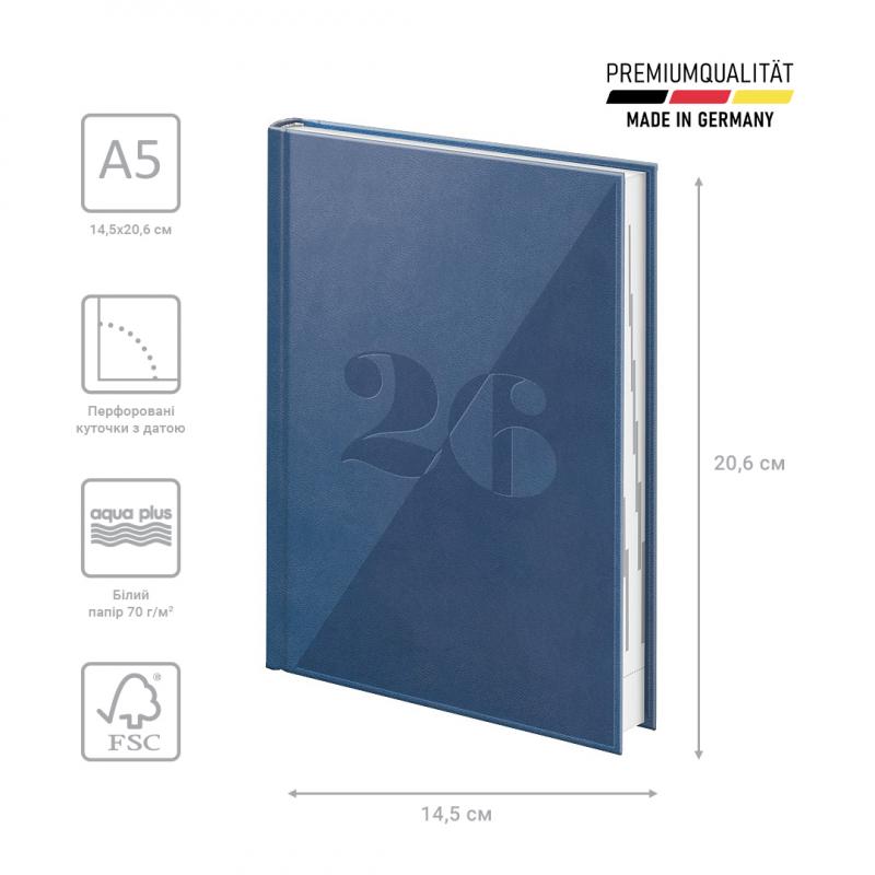 Білий європейський папір 70 г/м2. Закладка-лясе та відривні куточки з датою. Стильна обкладинка Torino Trend. Сліпе тиснення.