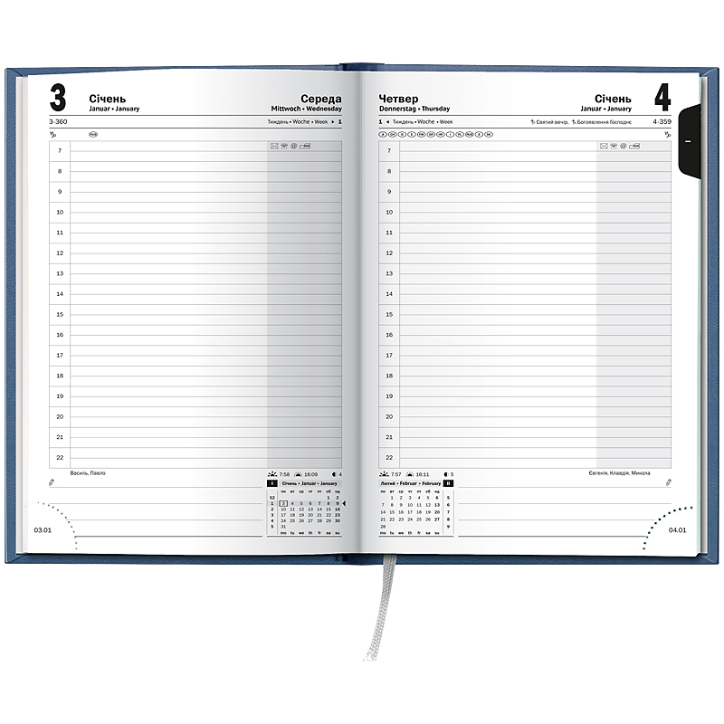 Особливості: Три мови: українська, англійська, німецька. Загальна кількість сторінок — 336. Одна сторінка — один день.