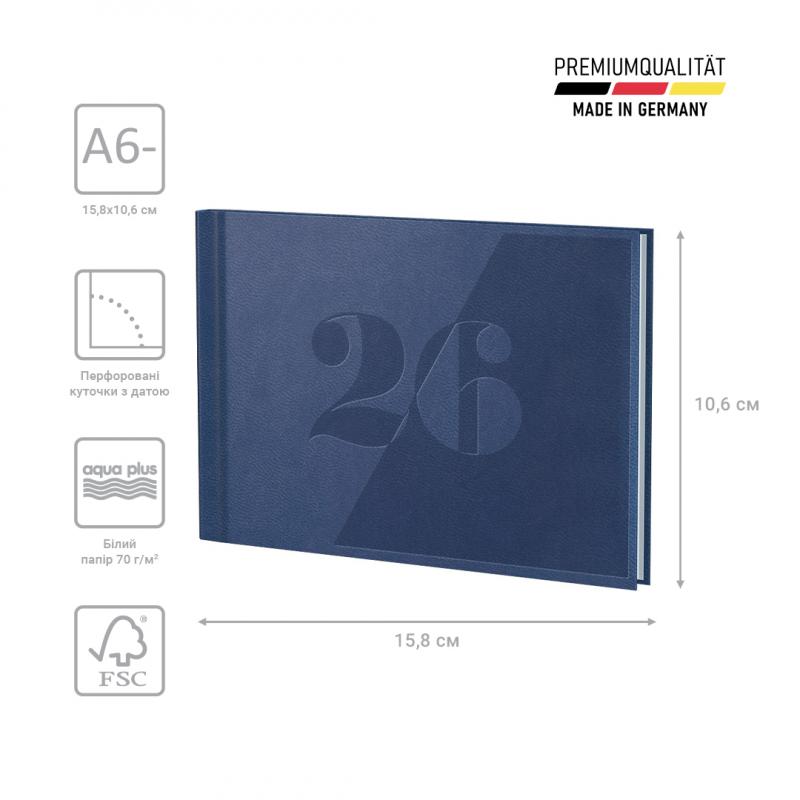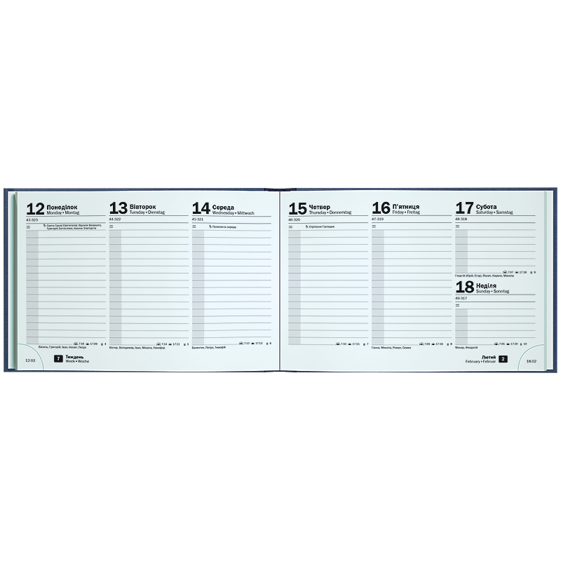 Кишеньковий формат А6-. Дві сторінки – один тиждень. Інформаційний блок. Перфоровані датовані куточки.