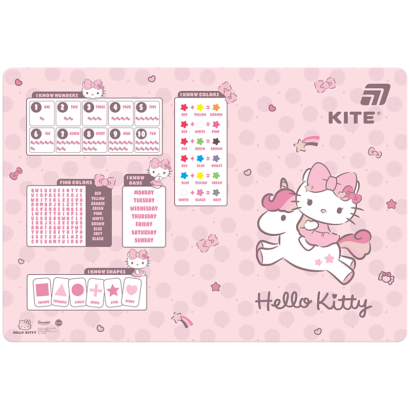 Настільна пластикова підкладка Hello Kitty використовується для творчості: малювання фарбами і олівцями, ліплення пластиліном, роботи з клеєм і папером. Також підкладку можна використовувати під столові прилади.