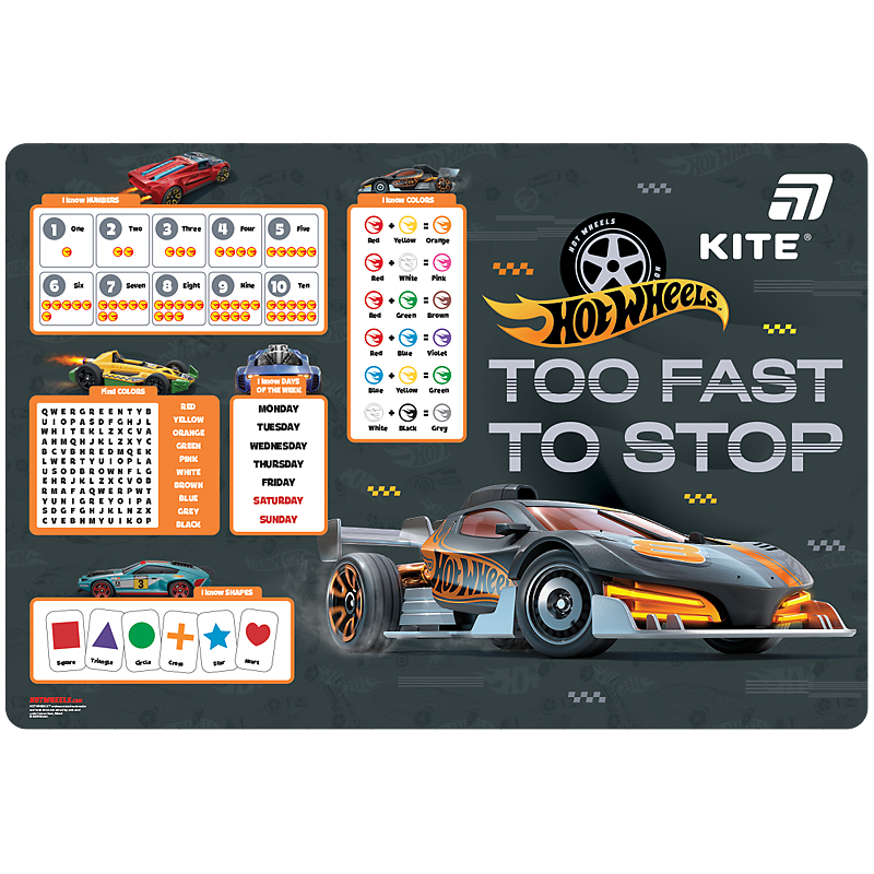 Настільна пластикова підкладка Hot Wheels використовується для творчості: малювання фарбами і олівцями, ліплення пластиліном, роботи з клеєм і папером. Також підкладку можна використовувати під столові прилади.