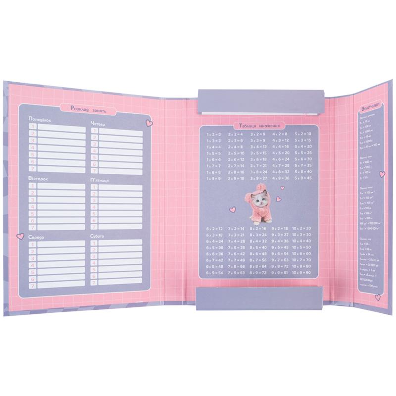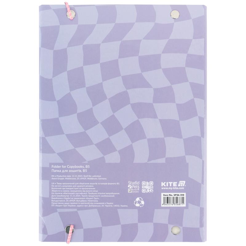 Папка має одне відділення. Призначена для зберігання щоденника і зошитів формату В5. Формат папки ідеально вміщається в будь-яку модель рюкзаків Kite і тримає в порядку зошити дитини, зберігаючи їх від зам'яття.