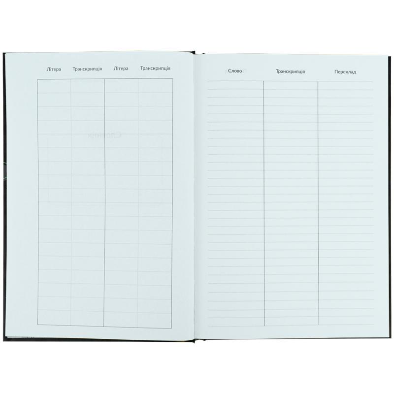 Передбачені окремі сторінки для запису правил. На якісному світлому папері щільністю 65 г/м2 комфортно писати. Практична обкладинка забезпечує тривале збереження словника в акуратному вигляді. Тверда палітурка – ідеальне рішення, адже словник буде використовуватися не один семестр. Стильний дизайн додасть гарного настрою та надихатиме навчатися із задоволенням.