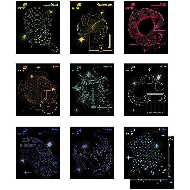 • в наборі – 10 предметних зошитів. З них 48 аркушів в клітинку це - Алгебра (2 шт), Географія, Геометрія, Історія, Фізика, Хімія, Біологія; 48 аркушів в лінію - Англійська мова; 24 аркуші в лінію - Українська мова;