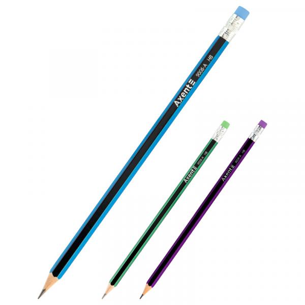 Олівець графітний, тригранний, з гумкою. Твердість НВ. Покриття: матовий кольоровий корпус, три чорні грані, кольорові смуги на ребрах. Асортимент кольорів корпусу: зелений, блакитний, фіолетовий. Упаковка - 100 шт. в тубусі.